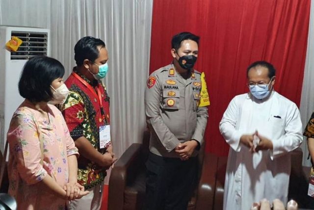 Kepala Gereja Katedral Romo Hani, langsung menyambangi pos pengamanan. Kedatangan Romo Hani diterima oleh Kapolsek Sawah Besar AKP Maulana Mukarom.